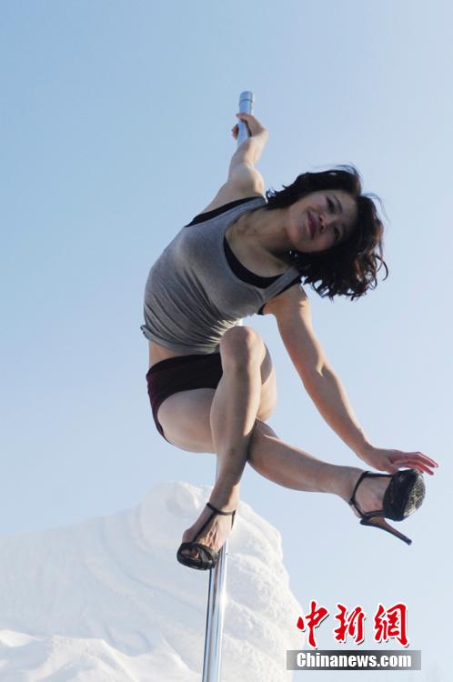 A pole dancer shows her moves in snow in Changchun, capital of northeast China's Jilin province, Jan. 19, 2015. The temperature that day was minus 20 degrees Celsius. It is said that the dancer wanted to show the charm of pole dancing through her moves, and to break people's prejudices against the dance. (CNS/Zhang Yao)