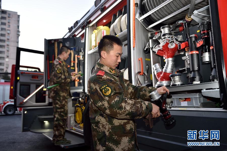 Wang Haitong, 19, checks the equipment on the fire-trunck on Jan. 9, 2015. (Xinhua/ Wang Shen)