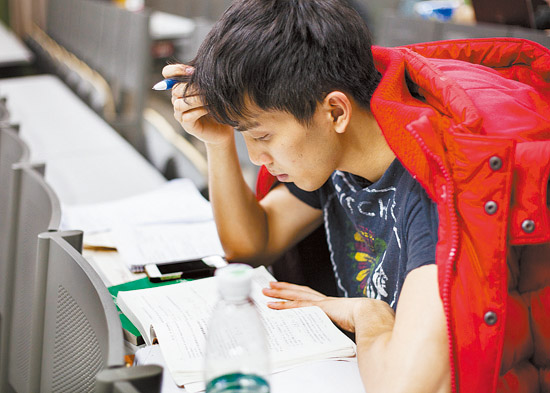 12:41 a.m., Dec. 23, 2014 - Liang Zhensheng, a college student, prepares for the final examination of the year. (Photo/China Youth Daily)