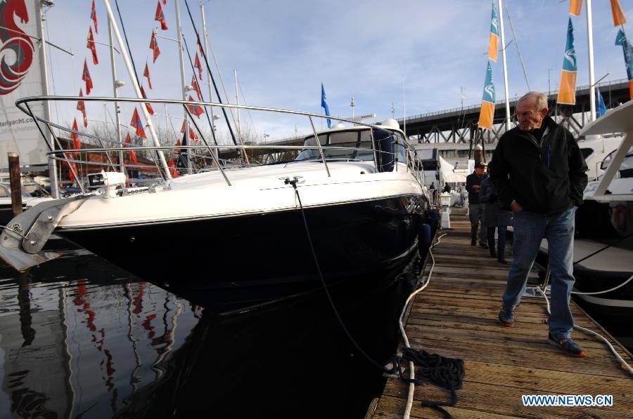 A visitor looks at a boat at the 2015 Vancouver International Boat Show at BC Place in Vancouver, Canada, Jan. 21, 2015. Canada's premier 5-day Vancouver International Boat Show featured the largest display of season's hottest boats, engines, electronics, marine gifts and accessories. (Xinhua/Sergei Bachlakov)