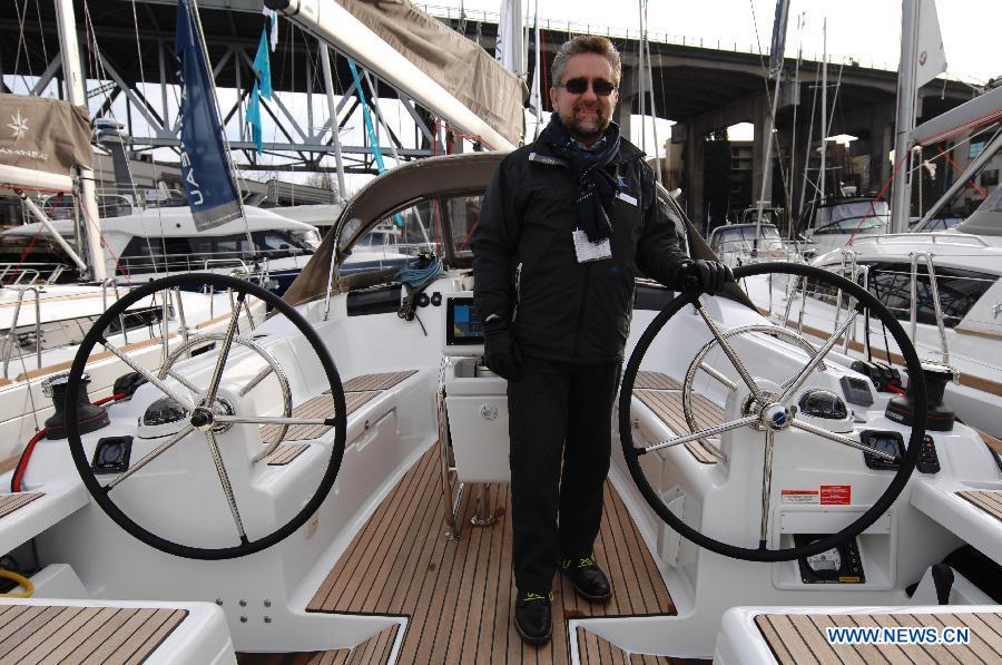 An exhibitor shows a boat at the 2015 Vancouver International Boat Show at BC Place in Vancouver, Canada, Jan. 21, 2015. Canada's premier 5-day Vancouver International Boat Show featured the largest display of season's hottest boats, engines, electronics, marine gifts and accessories. (Xinhua/Sergei Bachlakov)