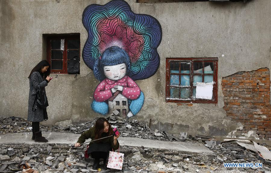 Citizens take photos of graffiti paingtings on a demolished wall in Shanghai, east China, Jan. 22, 2015. Graffiti paintings were found recently on debris at a residential lane, where old houses were demolished. (Xinhua/Fang Zhe)
