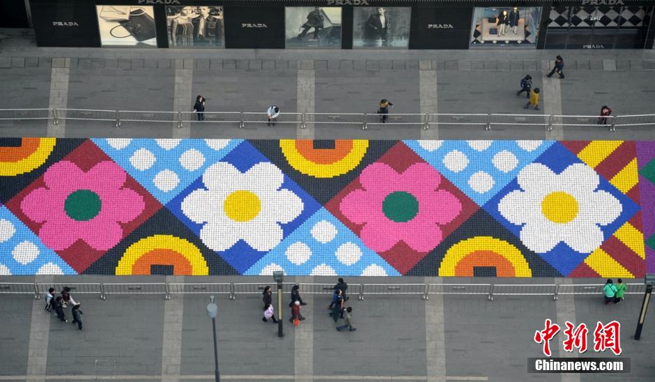 A huge beautiful "carpet", made from 19 tons of candies in different colors, is seen in Chengdu on Jan. 21, 2015. (Chinanews/Liu Zhongjun)