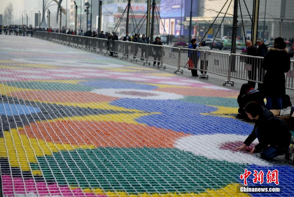 A huge beautiful "carpet", made from 19 tons of candies in different colors, is seen in Chengdu on Jan. 21, 2015. (Chinanews/Liu Zhongjun)