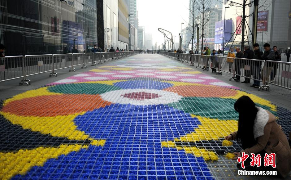 A huge beautiful "carpet", made from 19 tons of candies in different colors, is seen in Chengdu on Jan. 21, 2015. (Chinanews/Liu Zhongjun)