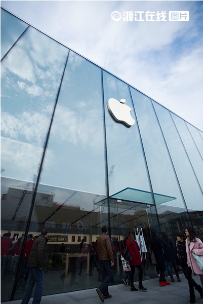 The apple store in Hangzhou, which will soon become the biggest apple store in Asia, is finally unveiled to the public on Jan. 20, 2015. Its special decoration has attracted a lot of people. The store will officially open on Jan. 24. (Zhejiang Online/Tong Xiaolei)