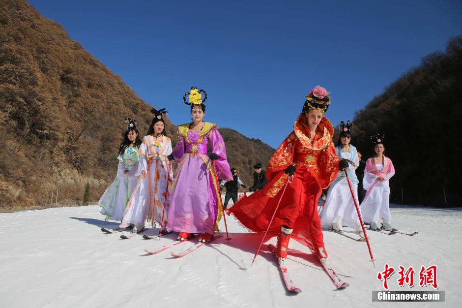A Chinese woman skis with a western woman in Ganshan Ski Resort, Sanmenxia city, central China's Henan province on Jan. 21, 2015. The two women wore Chinese ancient costumes to act as Empress Wu Zetian of the Tang Dynasty, attracting many tourists and photographers in the resort. (CNS/Wang Zhongju)