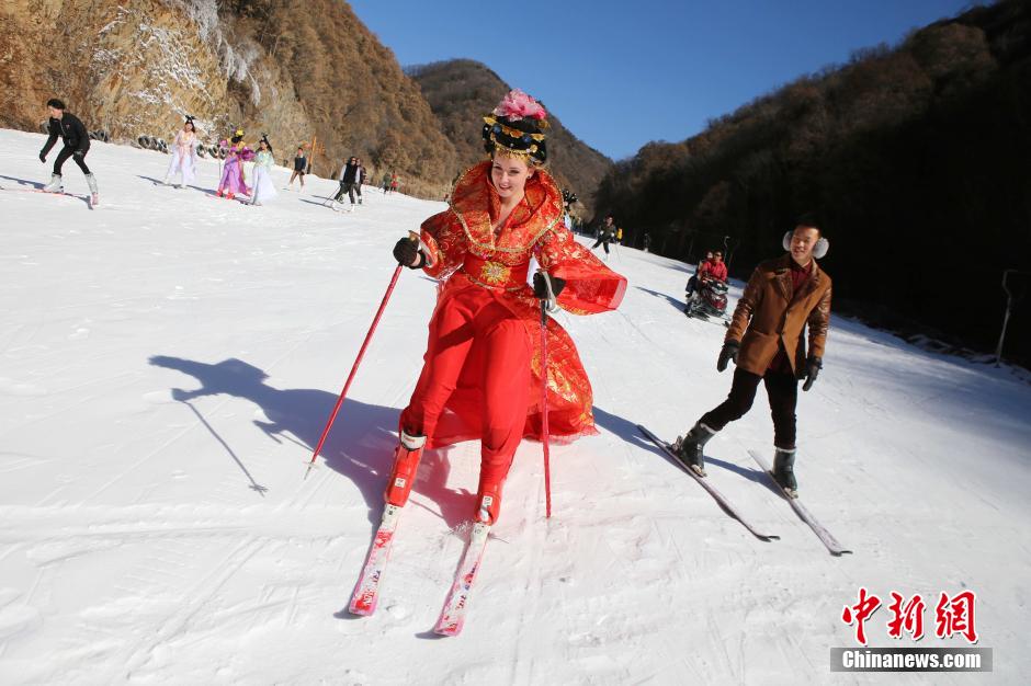 A Chinese woman skis with a western woman in Ganshan Ski Resort, Sanmenxia city, central China's Henan province on Jan. 21, 2015. The two women wore Chinese ancient costumes to act as Empress Wu Zetian of the Tang Dynasty, attracting many tourists and photographers in the resort. (CNS/Wang Zhongju)