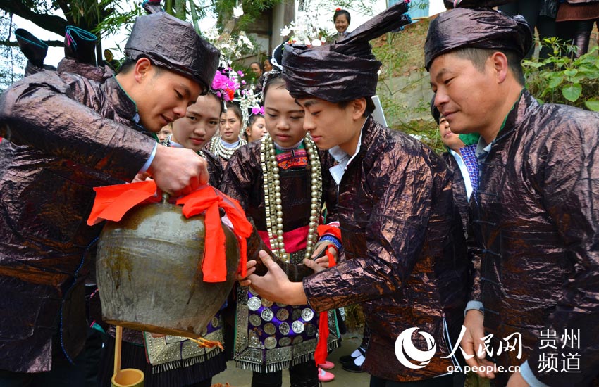 Villagers welcome guests with ox-horn wine in Congjiang county, southwest China's Guizhou province. (gz.people.cn/He Huiyu)