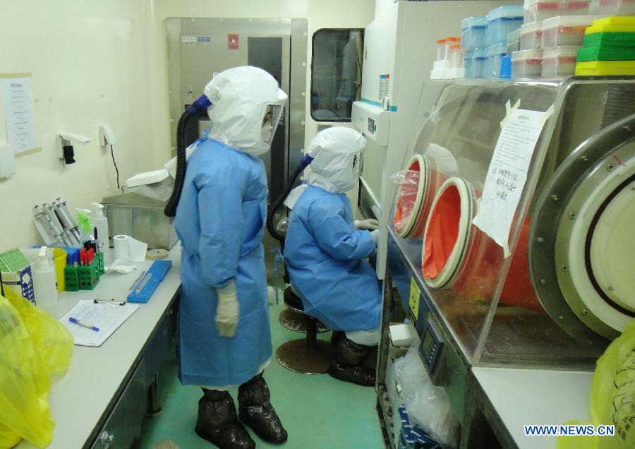 | Members of Chinese mobile laboratory team work at a laboratory in Freetown, capital of Sierra Leone, Jan. 22, 2015. The laboratory team have already tested 3,995 Ebola-related blood samples including 1,407 tested positive. (Xinhua/Xin Wenwen) |
