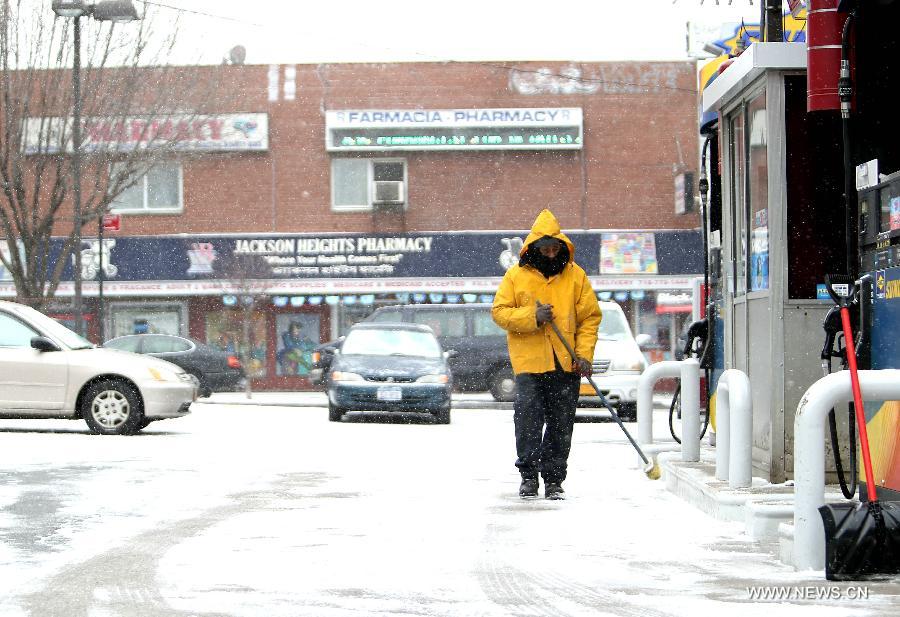A work cleans off snow at a gas station in New York City, the United States, Jan. 26, 2015. The U.S. National Weather Service issued a blizzard warning for New York City and surrounding areas between coastal New Jersey and Connecticut, beginning 1 p.m. EST (1800 GMT) Monday and worsening overnight into Tuesday morning. (Xinhua/Qin Lang)