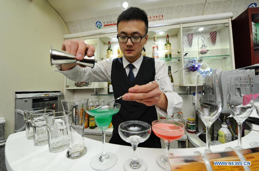 An attendant makes cocktail for passengers on "The Silk Road Station-Ningxia" train in Yinchuan, capital of northwest China's Ningxia Hui Autonomous Region, Jan. 26, 2015. The train, which started its debut journey from Yinchuan to Beijing, capital of China, on Jan. 26, is featured with its strong local flavor and high-end quality. (Xinhua/Peng Zhaozhi)