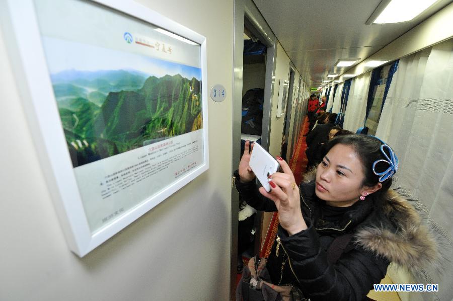 Passengers take photos of scenery pictures on the aisle of "The Silk Road Station-Ningxia" train in Yinchuan, capital of northwest China's Ningxia Hui Autonomous Region, Jan. 26, 2015. The train, which started its debut journey from Yinchuan to Beijing, capital of China, on Jan. 26, is featured with its strong local flavor and high-end quality. (Xinhua/Peng Zhaozhi)