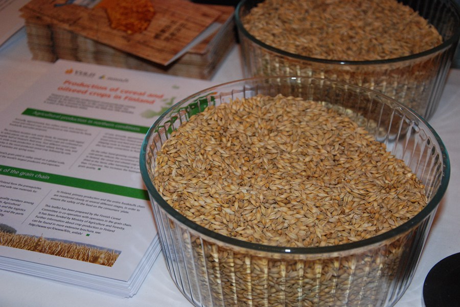 Grains from Finland displayed at the event. (People's Daily Online/Yao Xinyu)