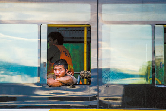 A migrant worker who works at a construction site near the Liangma River takes bus to go home.