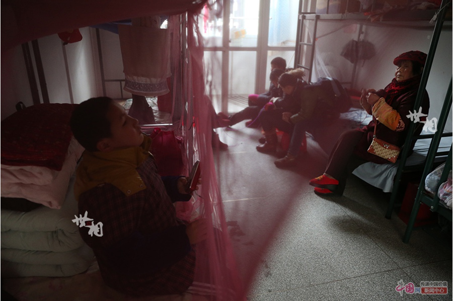 Li Xin's grandmother knits while Xin listens to the radio. (China.org/Pu Cun)