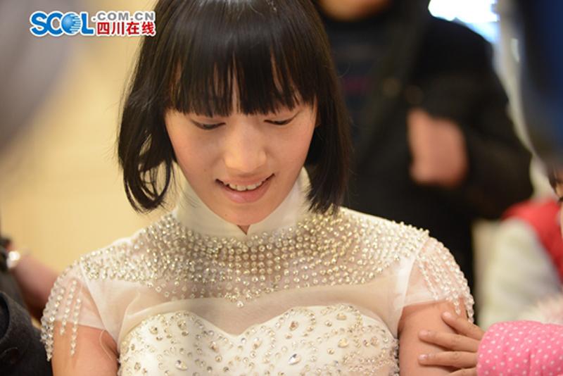 Xu Yan is shy when she looks into the mirror. (Photo/scol.com.cn)