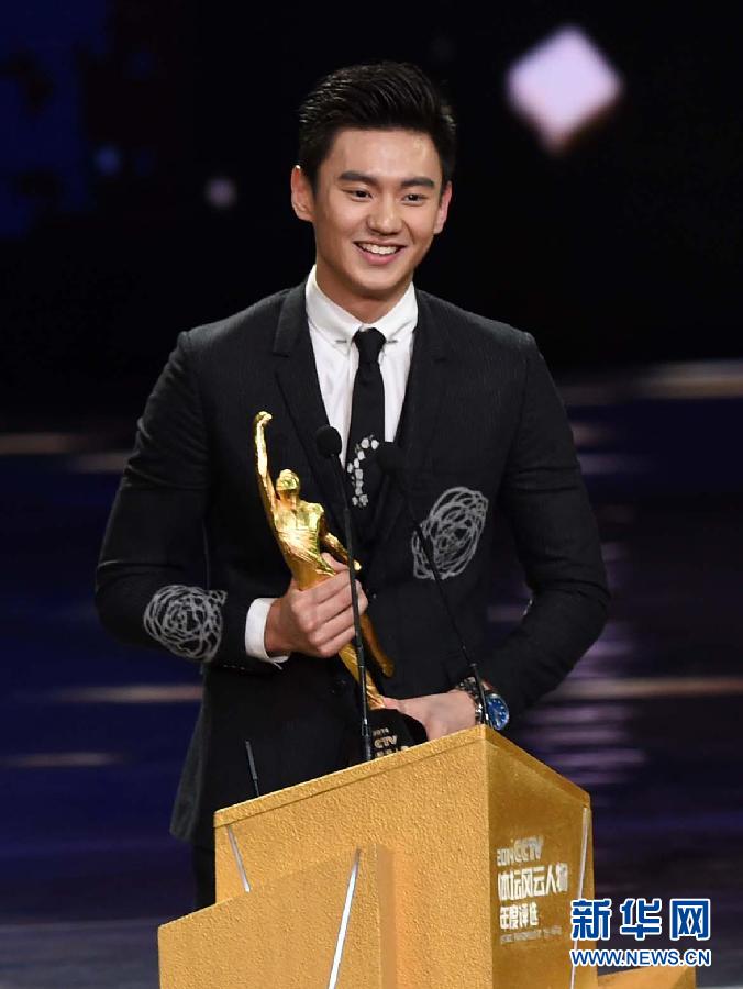 | Swimming athlete Ning Zetao poses with trophy at the awarding ceremony of the 2014 Sports Personality of the Year after he was awarded the Best Male Athlete of the year, in Beijing, capital of China, on Feb. 1, 2015. (Source: Xinhuanet.com) |