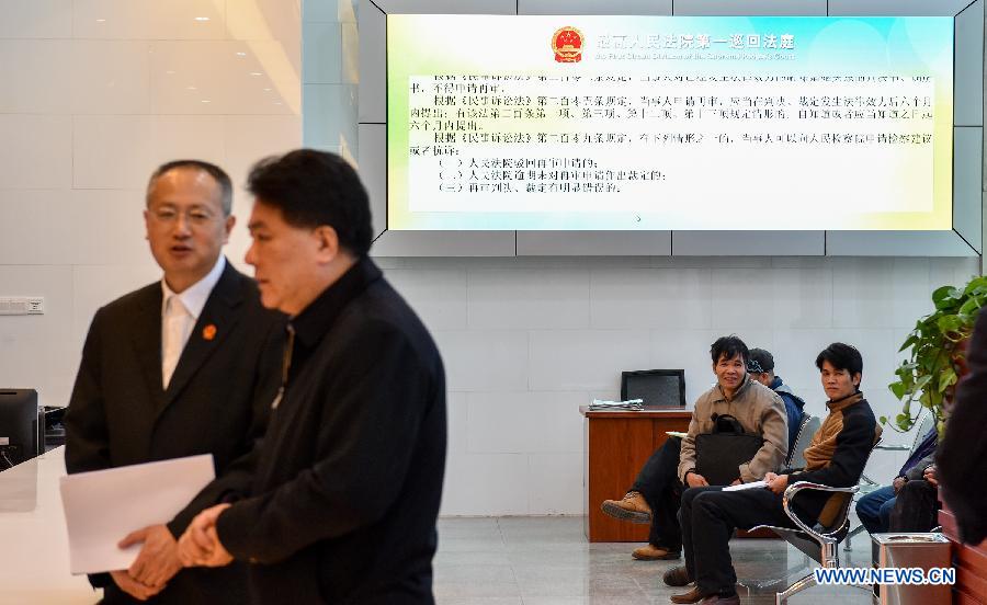 Claimants wait at the reception room of China's Supreme People's Court first circuit court in Shenzhen, south China's Guangdong Province, Feb. 2, 2015. The first circuit court of China's Supreme People's Court (SPC) began to hear cases officially Monday in Shenzhen. (Xinhua/Mao Siqian)