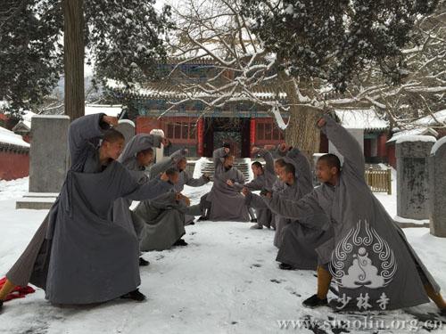 Shaolin Temple ushered in the first snow this year on Jan. 28, 2015. The snow ended early the next morning. Despite the bone-chilling cold, the monks in the temple practiced martial arts as usual in the snow. (Photo/shaolin.org.cn)