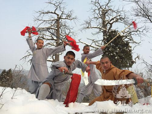 Shaolin Temple ushered in the first snow this year on Jan. 28, 2015. The snow ended early the next morning. Despite the bone-chilling cold, the monks in the temple practiced martial arts as usual in the snow. (Photo/shaolin.org.cn)