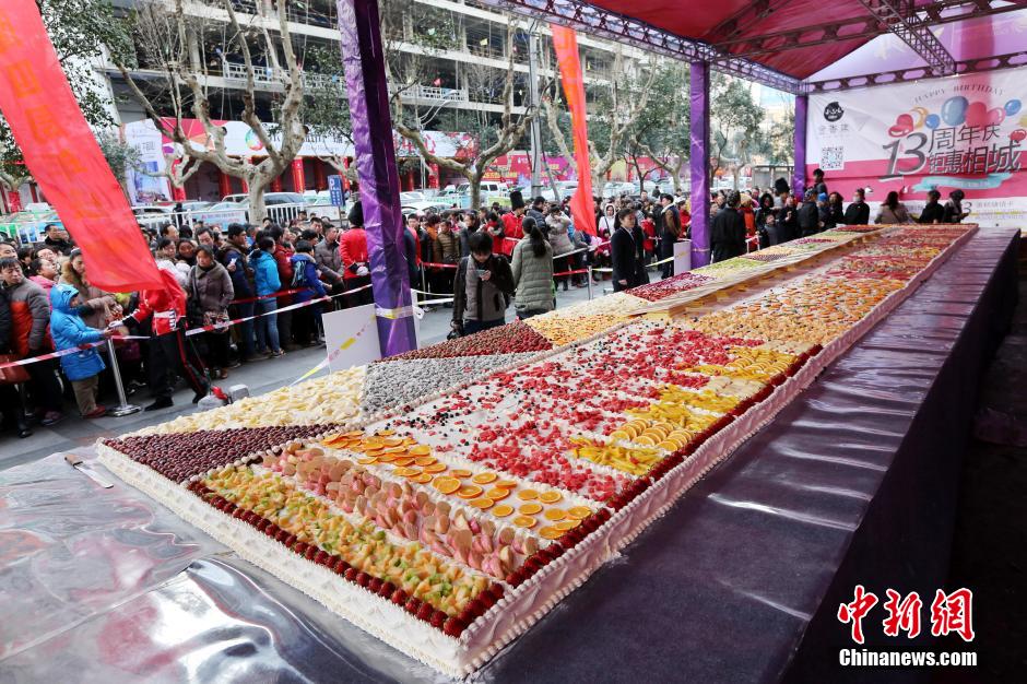 A 24-square-metre cake, made of fresh fruits including pineapple and strawberry is exhibited in Huaibei, east China's Anhui province on Jan. 18, 2015. Nine cooks spent more than eight hours to finish this cake. More than 5000 residents could taste this cake. (CNS/Wan Shanchao)