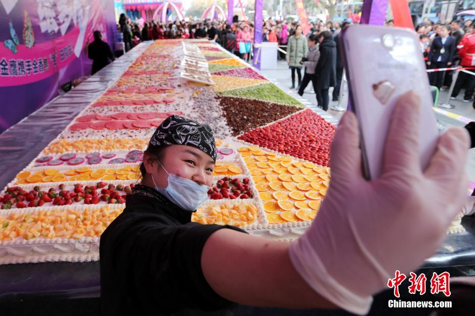A 24-square-metre cake, made of fresh fruits including pineapple and strawberry is exhibited in Huaibei, east China's Anhui province on Jan. 18, 2015. Nine cooks spent more than eight hours to finish this cake. More than 5000 residents could taste this cake. (CNS/Wan Shanchao)