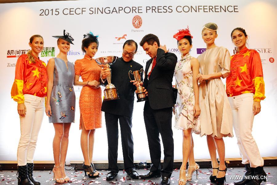 China Horse Club (CHC) Chairman (4th L) Teo Ah Khing and General Manager Eden Harrington (4th R) unveil the Singapore race trophies at the press conference held in Singapore's Ritz-Carlton, Feb. 3, 2015. The CHC held a press conference on Tuesday in Singapore for the upcoming China Equine Cultural Festival (CECF) Singapore. The CECF Singapore will be held on Feb. 21-22. (Xinhua/Then Chih Wey)