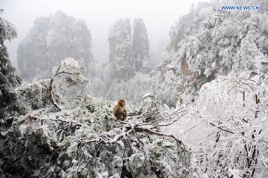 Photo taken on Feb. 3, 2015 shows a macaque on snow-covered tree branches at Wulingyuan National Park in Zhangjiajie City, central China's Hunan Province. (Xinhua/Zhang Mingtao)