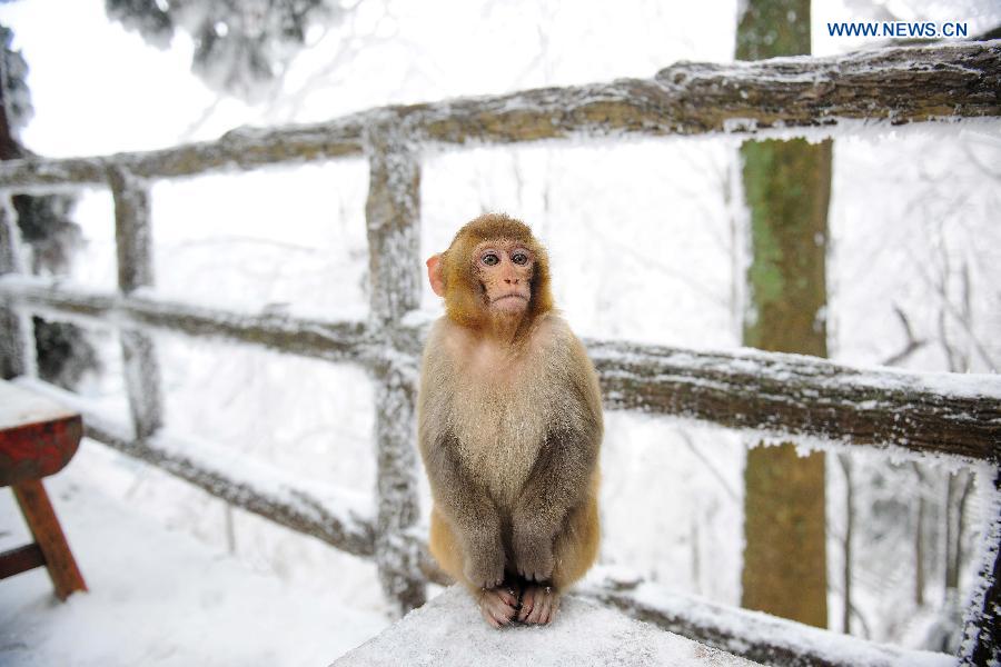 | Photo taken on Feb. 3, 2015 shows a macaque at snow-covered Wulingyuan National Park in Zhangjiajie City, central China's Hunan Province. (Xinhua/Zhang Mingtao) |