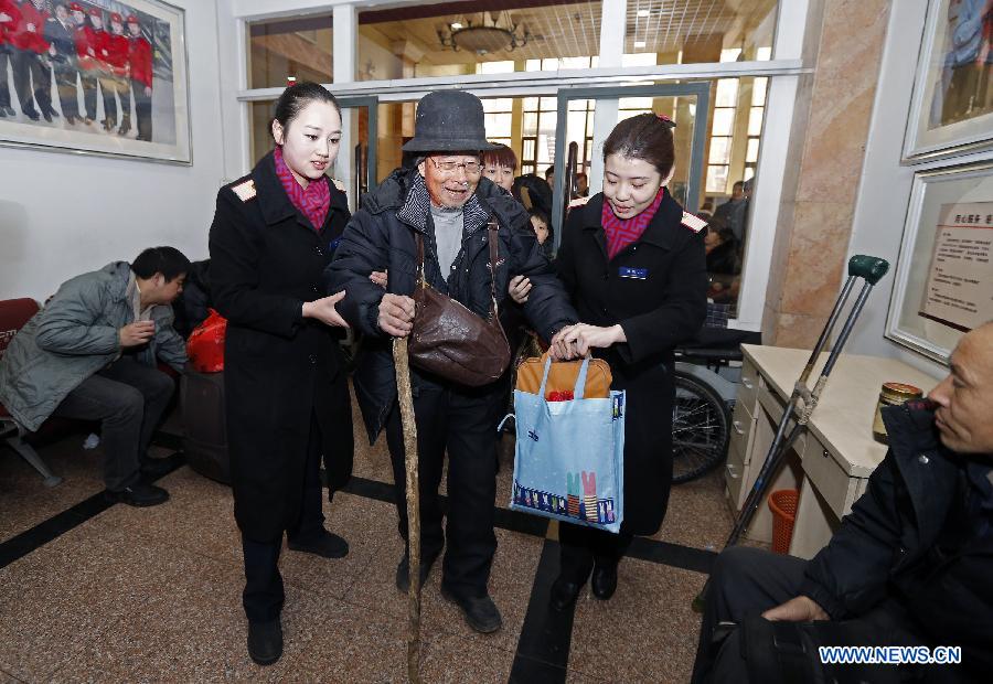 Staff workers of the Beijing Railway Station help a passenger into a rest room for people in need in Beijing, capital of China, Feb. 2, 2015. A 40-day spring festival travel rush will soon begin, during which the Beijing Railway Station is expected to send 4.2 million passengers and receive 4.3 million passengers. The station has taken out measures to better serve passengers on their way.(Xinhua/Shen Bohan)