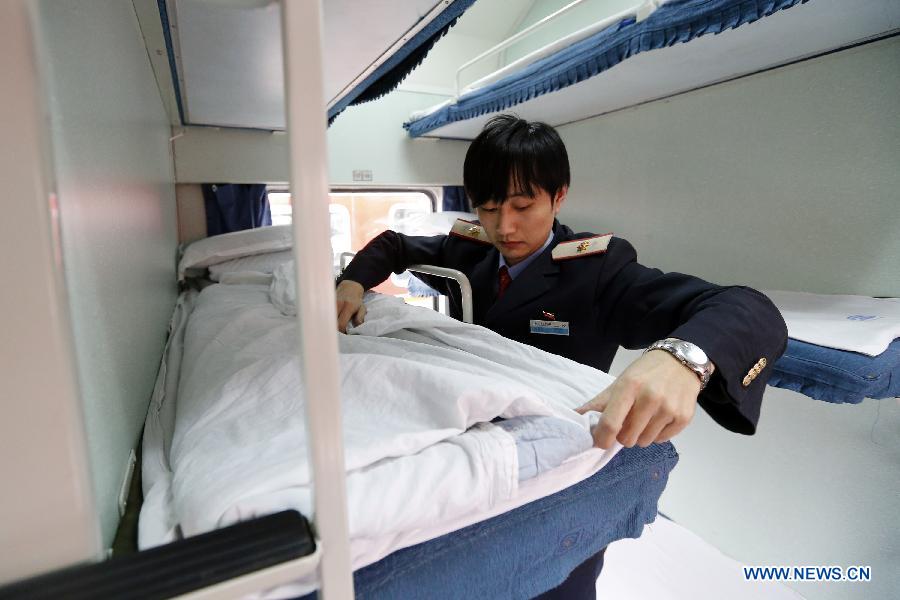 A staff member puts away beds in a train at a train depository of the Beijing Railway Bureau in Beijing, capital of China, Feb. 2, 2015. A 40-day spring festival travel rush will soon begin, during which the Beijing Railway Station is expected to send 4.2 million passengers and receive 4.3 million passengers. The station has taken out measures to better serve passengers on their way.(Xinhua/Shen Bohan)