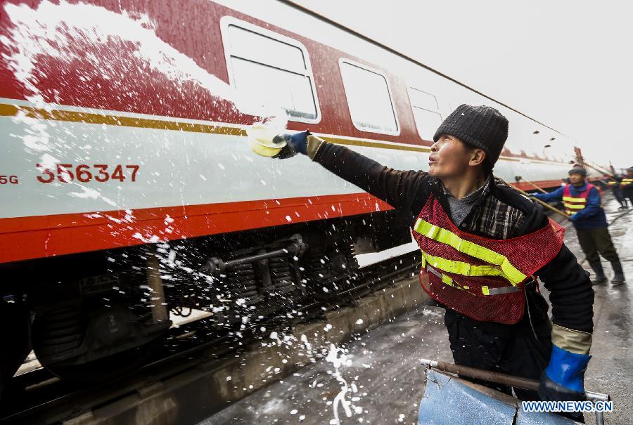 A worker cleans the surface of a train in a train depository of the Beijing Railway Bureau in Beijing, capital of China, Feb. 2, 2015. A 40-day spring festival travel rush will soon begin, during which the Beijing Railway Station is expected to send 4.2 million passengers and receive 4.3 million passengers. The station has taken out measures to better serve passengers on their way.(Xinhua/Shen Bohan)