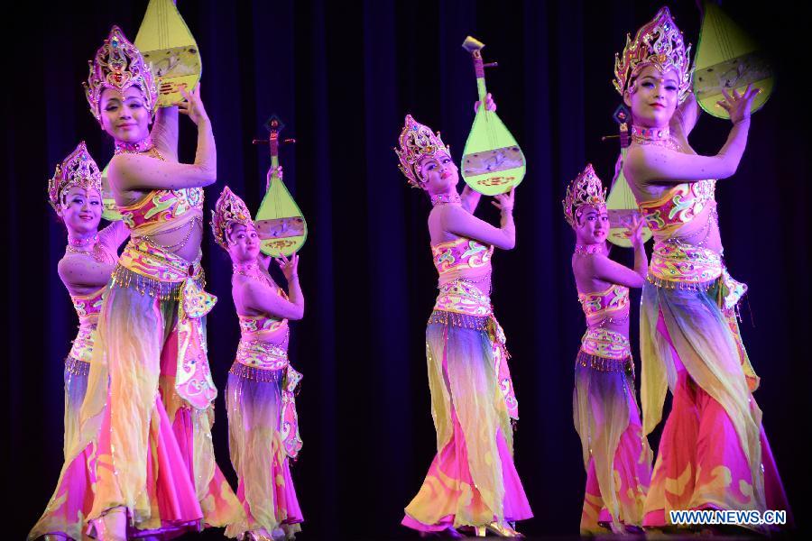 Chinese artists dance in a performance at the National Theater in Dhaka, Bangladesh, Feb. 3, 2015. A three-day Chinese cultural program started on Monday to mark the 40th anniversary of the establishment of the China-Bangladesh diplomatic relations. (Xinhua/Shariful Islam)