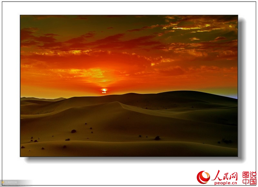 | Tengger Desert, located between Helan Mountain and Yabulai Mountain in northwest China, is the fourth largest desert of China, with an area of 42,700 square kilometers. “Tengger” means “sky” in Mongolian, which is to say that the desert is as vast as the sky. (Photo source: people.cn) |
