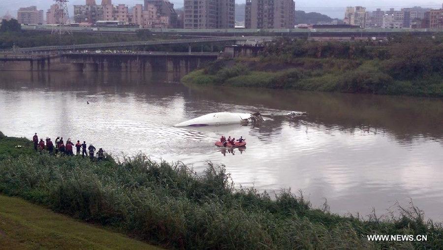 Rescuers work at the site of the plane accident in Taipei, southeast China's Taiwan, Feb. 4, 2015. A plane of the Taiwan TransAsia Airways came down into a Taipei river Wednesday, with more than 50 people on board, confirmed the civil aviation authorities of Taiwan. Contact with the ATR-72 Flight, scheduled from Taipei to Kinmen, lost at about 11 a.m. Then the plane was found in the river by the Nanhu Bridge. (Xinhua)