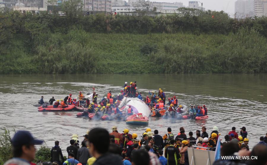 Rescuers carry out rescue operation after a plane plunged into a river in Taipei, southeast China's Taiwan, Feb. 4, 2015. A Taiwan TransAsia Airways plane crashed into a Taipei river on Wednesday morning, killing at least 12 people. Flight ATR-72, which was headed for Kinmen from Taipei, had 58 people on board, including 31 passengers from the Chinese mainland. It crash landed in the Keelung River after it clipped an elevated motorway with its wing. (Xinhua/Jin Liwang)