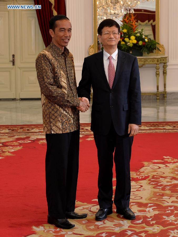 | ndonesian President Joko Widodo (L) meets with Meng Jianzhu, a special envoy of Chinese President Xi Jinping and the head of the Commission for Political and Legal Affairs of the Communist Party of China (CPC) Central Committee, in Jakarta, Indonesia, on Feb. 3, 2015. (Xinhua/He Changshan) |