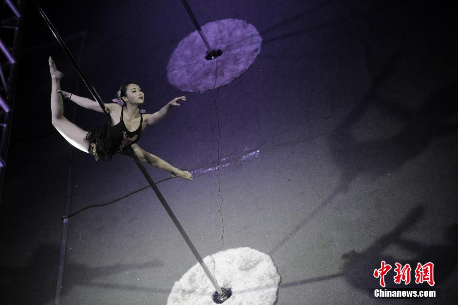 The qualification game of World Pole Dance Championship is held in Tianjin on Feb. 2, 2015. Seven members of the Chinese National Pole Dance Team competed for four berths. The 2015 World Pole Dance Championship will be held in China. (Chinanews/Tong Yu)