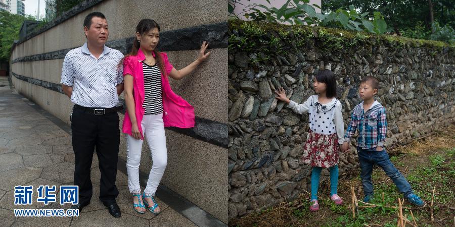 Left-behind children stand by an old wall in their hometown while their parents by a wall in a city.(Xinhua/Liu Jie)
