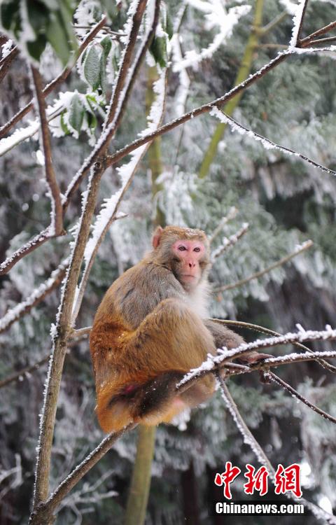 | A monkey plays in the snow world in Zhangjiajie National Forest Park in central China's Hunan province on Feb. 3, 2015. Its cute expressions melted the hearts of tourists. (Photo/CNS) |