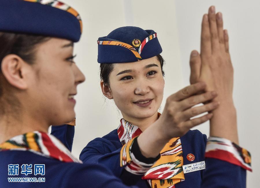 Stewardesses of the high-speed train in Xinjiang Railway Station prepare for the travel rush of Spring Festival. (Xinhua/Zhao Ge)