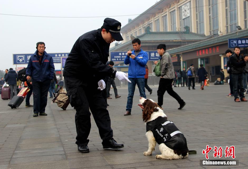 A police officer patrols with the dog on the square of the railway station in Xi'an, capital of Shaanxi province on Feb. 3, 2015. (CNS/Ma Zhifeng)