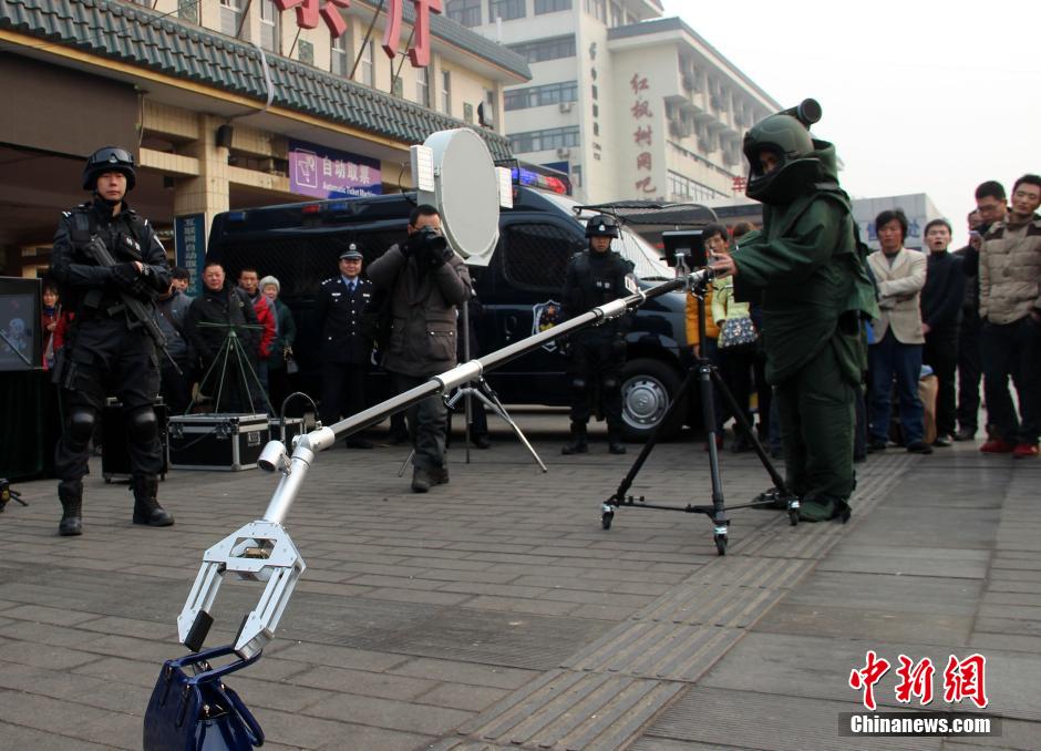 Police officers show the anti-terrorism equipment at the railway station in Xi'an on Feb. 3, 2015. (CNS/Ma Zhifeng)