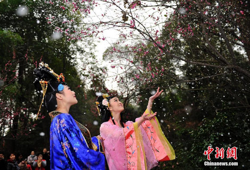 Two girls in ancient costumes enjoy themselves amidst the plum blossoms at Du Fu's Thatched Cottage in Chengdu, southwest China's Sichuan province. The blooming flowers have attracted many tourists to come and enjoy the natural beauty. (CNS/An Yuan)
