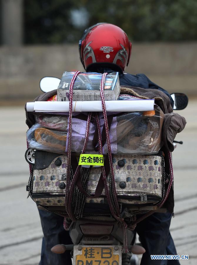 Photo taken on Feb. 5, 2015 shows a man returning home by motorcycle on the Wuzhou section of 321 national highway in south China's Guangxi Zhuang Autonomous Region. Many migrant workers in Guangxi chose to ride motorcycles back home for Spring Festival. The 40-day travel frenzy known as "Chunyun", the hectic period surrounding Spring Festival, which falls this year on Feb. 19, began on Feb. 4 and will last until March 16. (Xinhua/Huang Xiaobang)