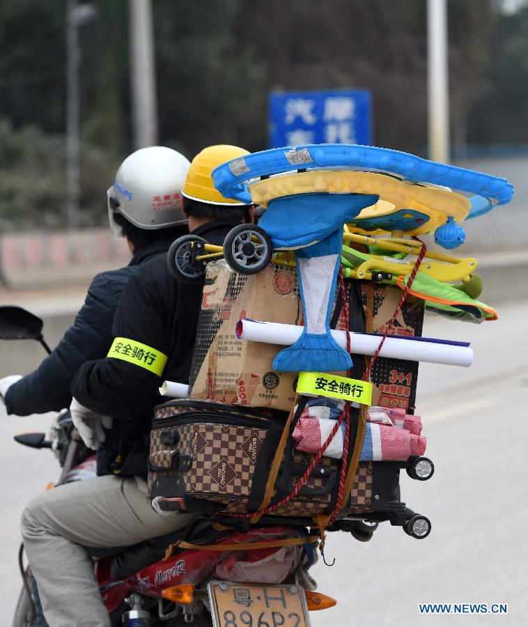 Photo taken on Feb. 5, 2015 shows two men returning home by motorcycle carry lots of luggage on the motorcycle on the Wuzhou section of 321 national highway in south China's Guangxi Zhuang Autonomous Region. Many migrant workers in Guangxi chose to ride motorcycles back home for Spring Festival. The 40-day travel frenzy known as "Chunyun", the hectic period surrounding Spring Festival, which falls this year on Feb. 19, began on Feb. 4 and will last until March 16. (Xinhua/Huang Xiaobang)