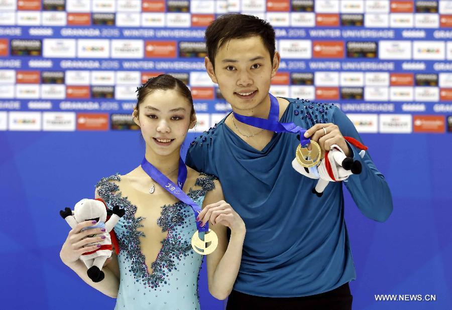 Yu Xiaoyu (L) and Jin Yang pose for photos after winning the final of pairs free skating at the 27th World Winter Universiade in Granada, Spain, Feb. 7, 2015. The Chinese pair claimed the title with 181.92 points in the event, the first gold medal of the Chinese delegation. (Xinhua/Meng Yongmin)