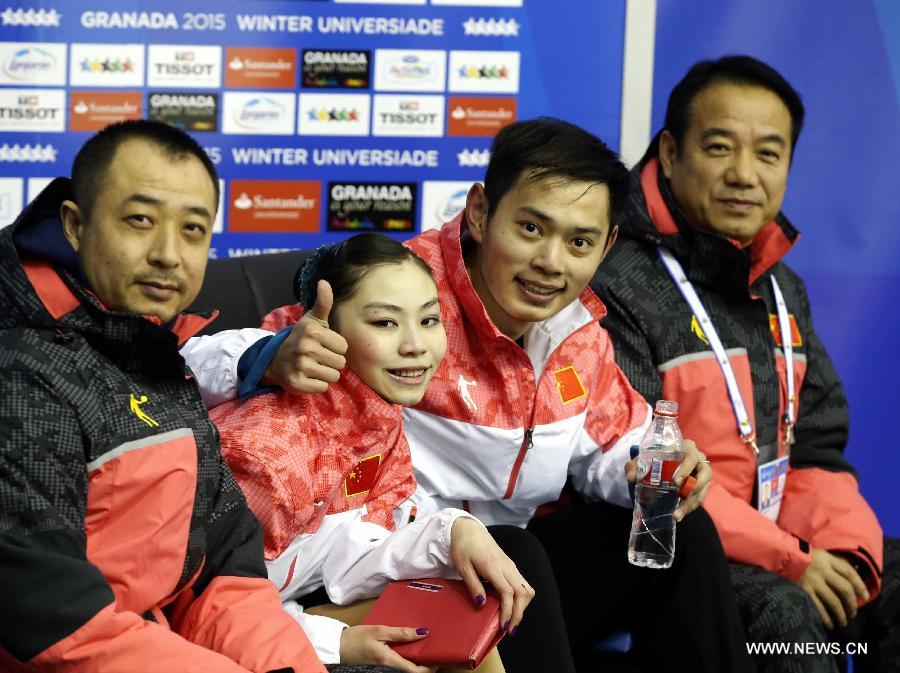 Yu Xiaoyu (front) and Jin Yang perform during the final of pairs free skating at the 27th World Winter Universiade in Granada, Spain, Feb. 7, 2015. The Chinese pair claimed the title with 181.92 points in the event, the first gold medal of the Chinese delegation. (Xinhua/Fei Maohua)