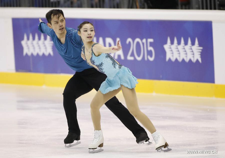 Yu Xiaoyu (R) and Jin Yang perform during the final of pairs free skating at the 27th World Winter Universiade in Granada, Spain, Feb. 7, 2015. The Chinese pair claimed the title with 181.92 points in the event, the first gold medal of the Chinese delegation. (Xinhua/Meng Yongmin)